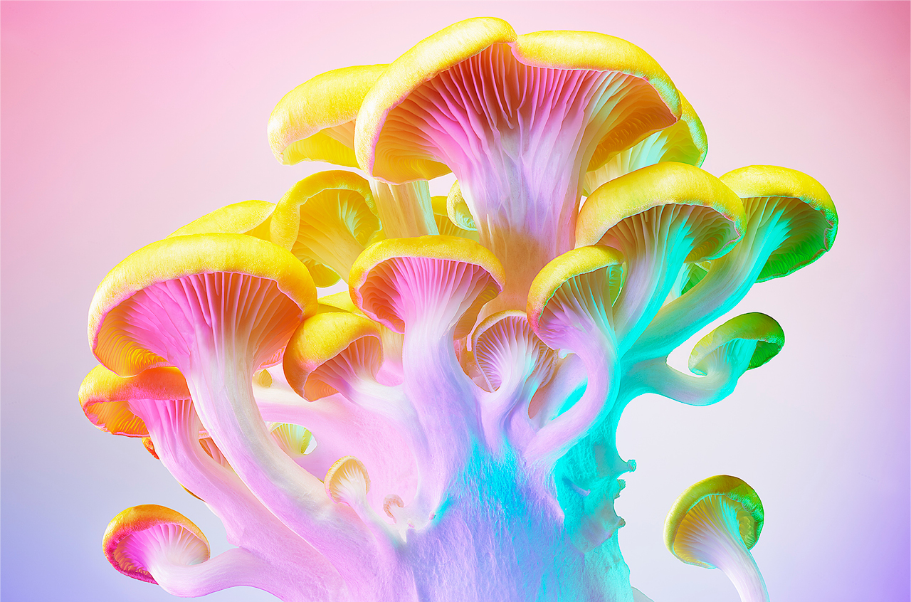 My lighting setup consisted of a Broncolor Sunlamp behind a piece of 210 Lee diffusion in a 3×4 frame as a key light, providing overall pop and defining shadow structure. Using reflectors with grids and a variety of gels, I’d place three to four more lights at different angles to apply color to both the mushrooms and the background. A softbox was placed overhead to softly illuminate the image and blend the colors together. Lighting isn’t a precise science for me—it’s about exploring possibilities, experimentation, and discovery. With digital photography, you can continually iterate on set quickly. When I finally land on the right illumination of the subject, it’s really an aha moment.