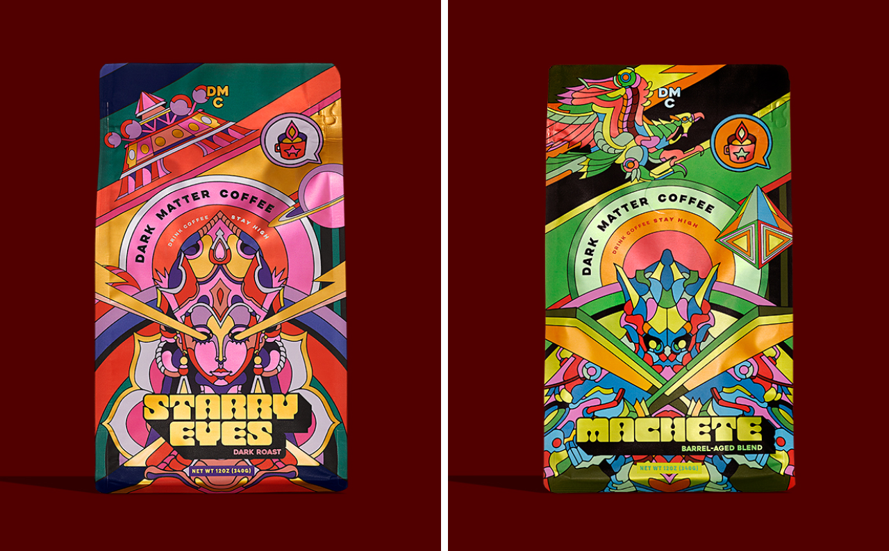 Dark Matter Coffee’s long-established core brands–Unicorn Blood, A Love Supreme, Starry Eyes, and Machete–make up the foundation of their Portfolio Blends and are diehard fan favorites. (If you know anything about Dark Matter, it’s that they are continually pushing the boundaries of coffee while still consistently nailing the classics.) After many illustrious years without a design update, these four coffee bags were due for a reboot. Cue the mind-bending, galaxy-hopping, sci-fi-centric, creative brief.