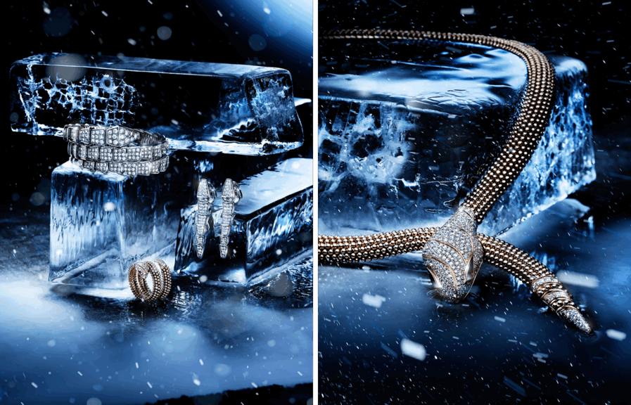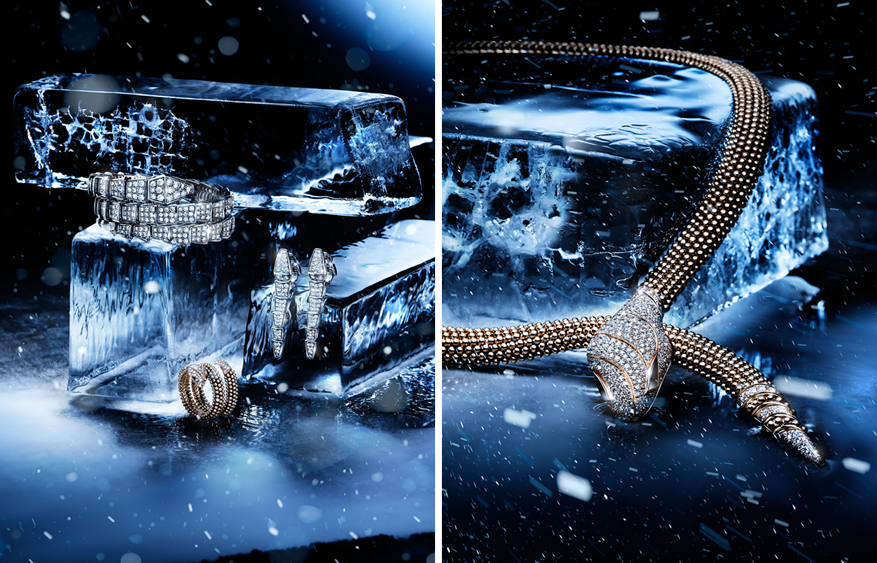 While Bulgari’s jewelry pieces are enduring by design, the moments we live in them are often brief and unforgettable. Thus, I wanted to photograph these iconic designs as fleeting instances in time, set among ice forms that—like the moments themselves—would exist only once and only for a short while. This approach meant incorporating elements I could not fully control—the melt of the ice, the slight movements of the jewelry, the momentary presence of mist. This was a bit of a departure from my usual studio approach (which I prefer to be more tightly controlled and repeatable), but also the right one for a story about transience.