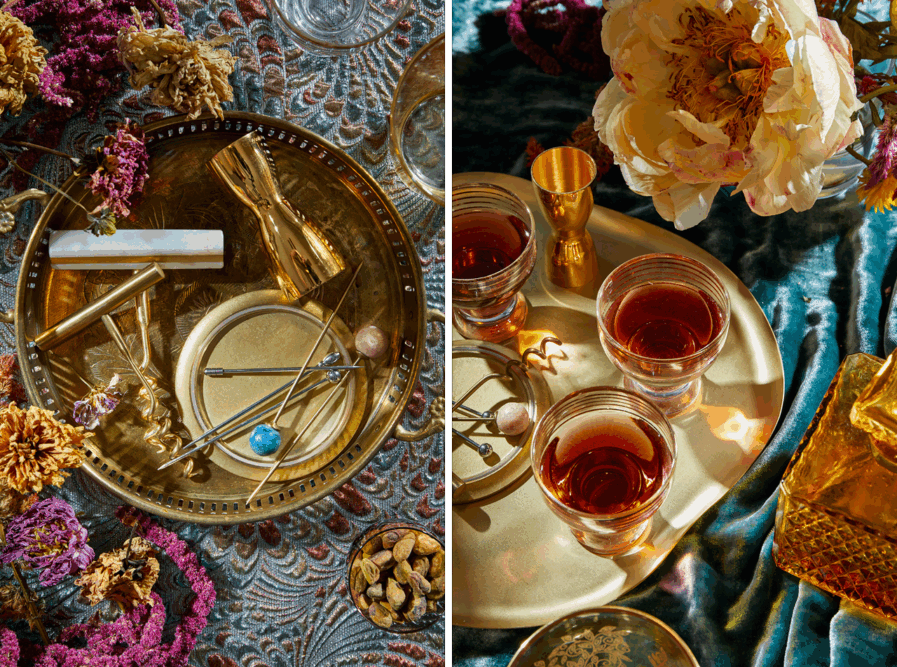 Process & Approach: I began with simple sketches before hunting down monochromatic elements—reflective fabrics, mirrors, and chrome surfaces—creating a silver universe where the cocktail and its container could burst with isolated color. The sleek vodka bottle was reminiscent of the 1960s Space Race aesthetics, demanding a fitting stage. For the amaro shot, I opted for an opposite approach, crafting an extravagant setting, replete with bar accessories and dried flowers.